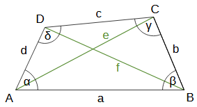 - Die Diagonale \(\overline{AB}\) wird mit e beschriftet, die Diagonale \(\overline{BD}\) wird mit f beschriftet